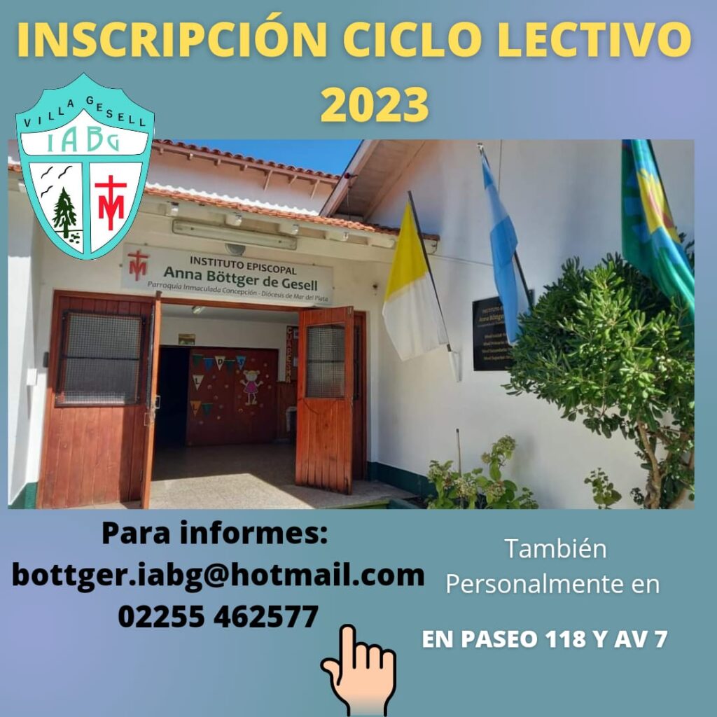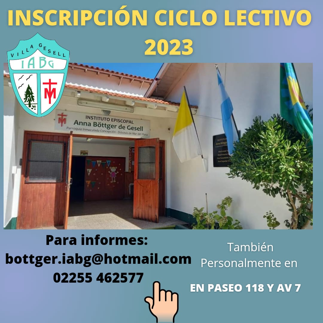 Querida comunidad de Villa Gesell: se encuentra abierta la preinscripción para el Ciclo Lectivo 2023 para todos los niveles del Instituto. Pueden comunicarse al mail: bottger.iabg@hotmail.com y solicitá la planilla de preinscripción o personalmente en Paseo 118 y Avenida 7. ¡Los esperamos!